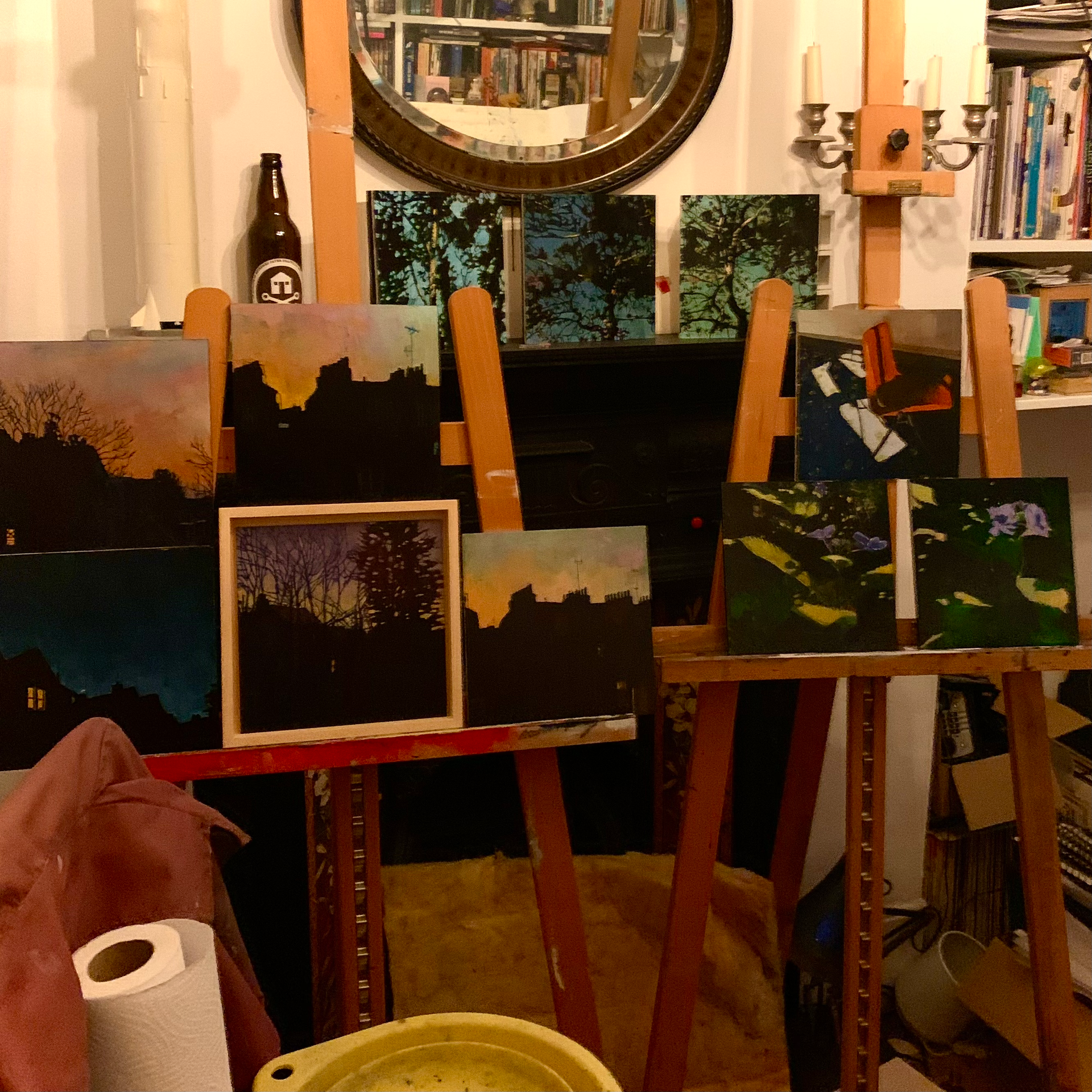 After a couple of studio moves for Polly this year, she has now taken over the dining room for her painting on the days she isn't teaching.